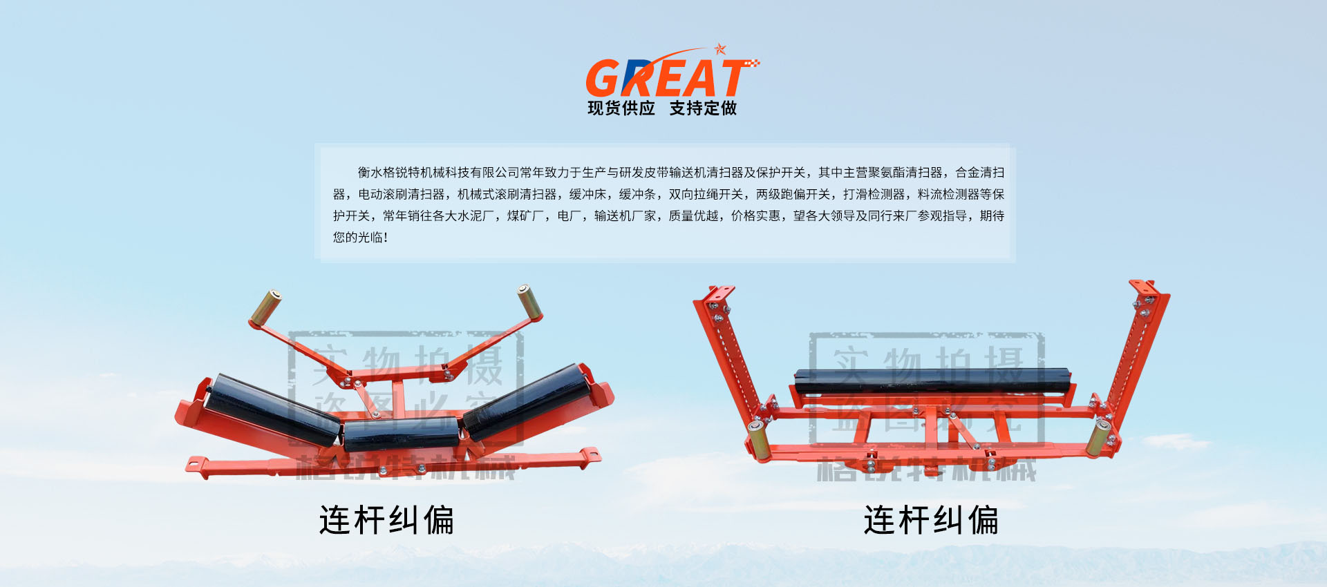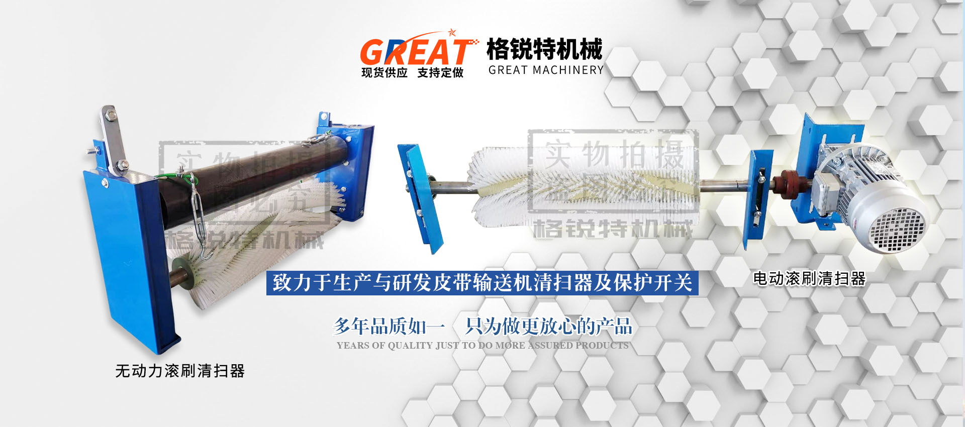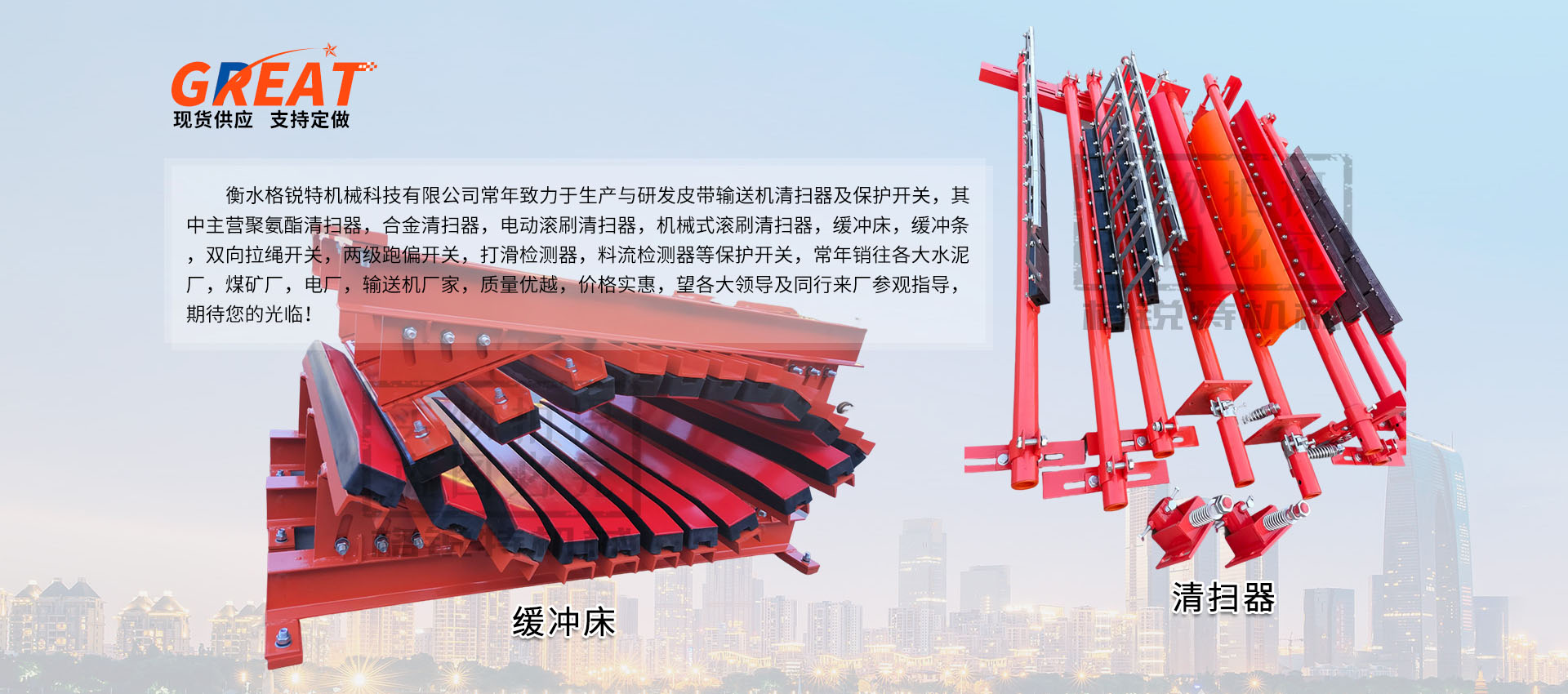 衡水格锐特机械科技有限公司常年致力于生产与研发皮带输送机清扫器及保护开关,其中主营聚氨酯清扫器,合金清扫器,电动滚刷清扫器,机械式滚刷清扫器,缓冲床,缓冲条,双向拉绳开关,两级跑偏开关,打滑检测器,料流检测器等保护开关,常年销往各大水泥厂,煤矿厂,电厂,输送机厂家,质量优越,价格实惠,望各大领导及同行来厂参观指导,期待您的光临!!!